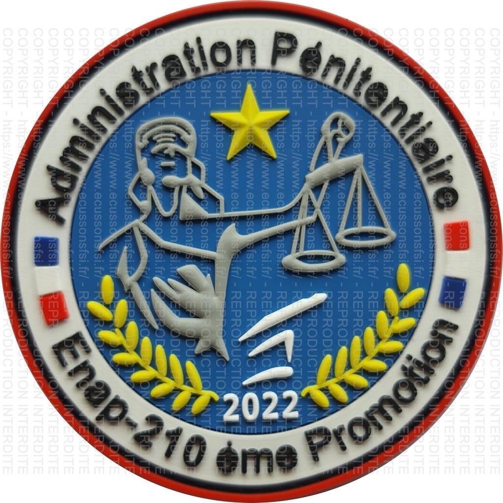Ecusson souvenir de la promotion 210 des élèves surveillants de l'Ecole Nationale de l'administration Pénitentiaire. Matière PVC 3D, diamètre 80 MM, scratch mâle cousu au dos , emballage individuel.