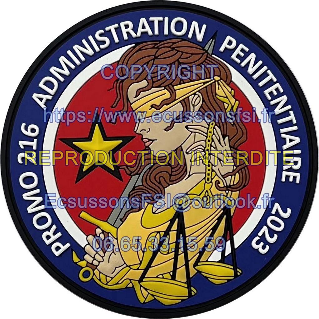 Ecusson souvenir de la promotion 216 des élèves surveillants de l'Ecole Nationale de l'administration Pénitentiaire. Matière PVC 3D, diamètre 80 MM, scratch mâle cousu au dos , emballage individuel.